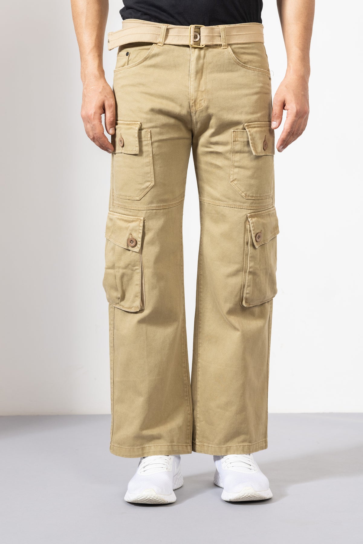 Beige Men Cotton Cargo Pants with Multiple Pockets