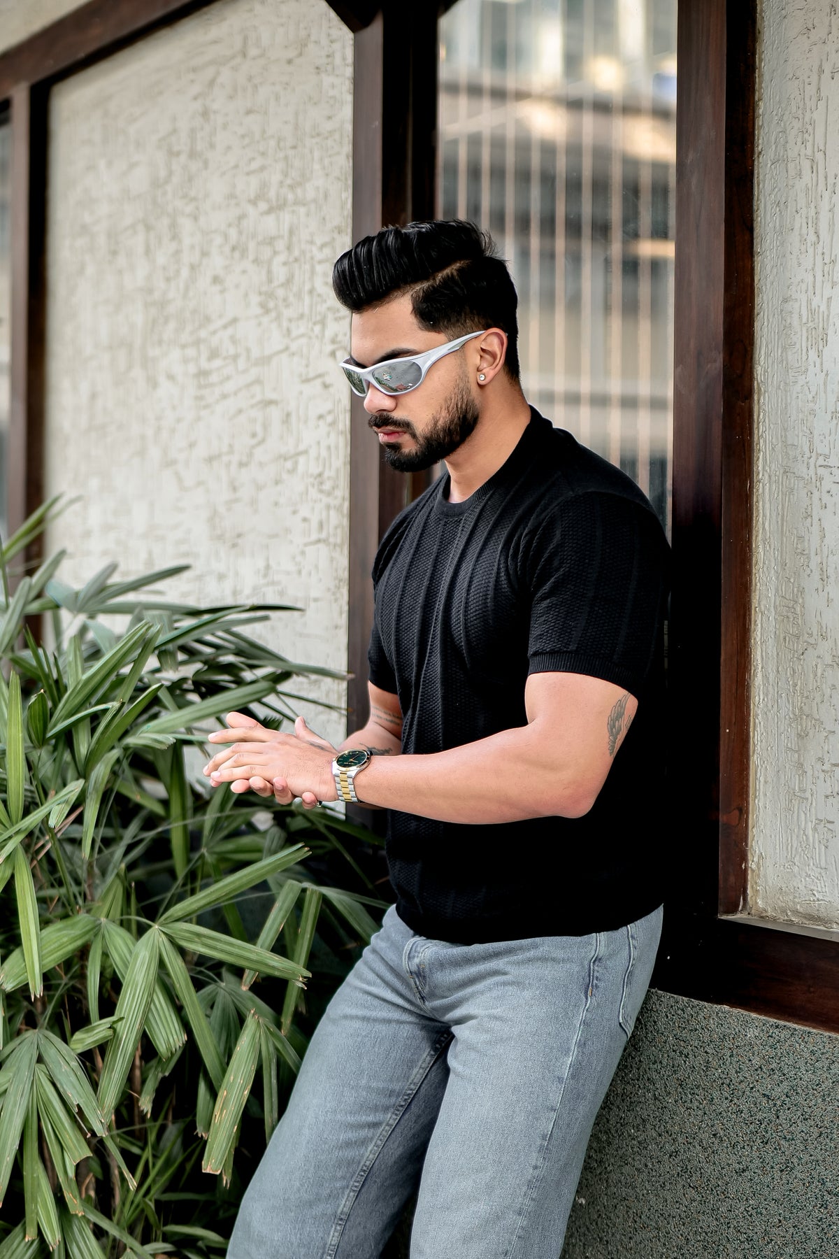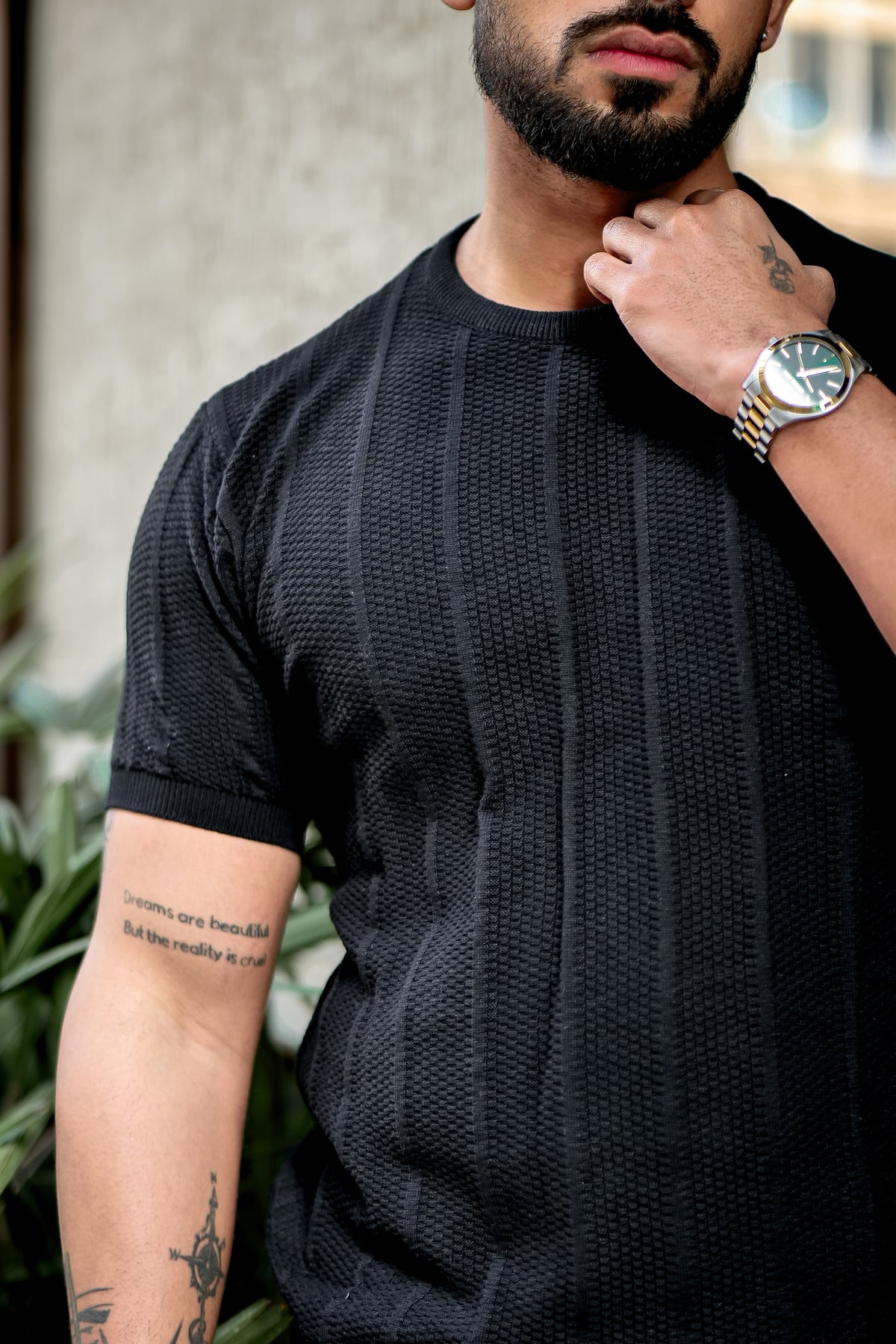 This Premium Regular Fit T-shirt from Gritstones is made in 100% cotton Flat Knit Fabric and comes with unique black self design pattern. Featuring short sleeves and round neck, it combines style and comfort effortlessly. Perfect for smart casual and streetwear looks, it's a must have for the fashion-forward men.