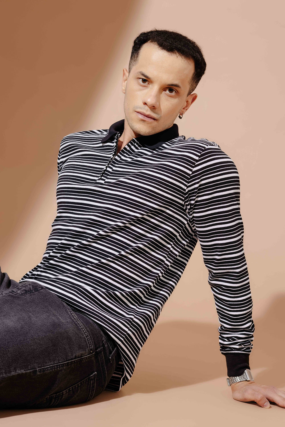 This regular fit collar neck t-shirt from Gritstones is made in 100% cotton fabric and comes with unique self design pattern. Featuring full sleeves and collar neck, it combines style and comfort effortlessly. Perfect for smart casual and streetwear looks, it's a must have for the fashion-forward men.