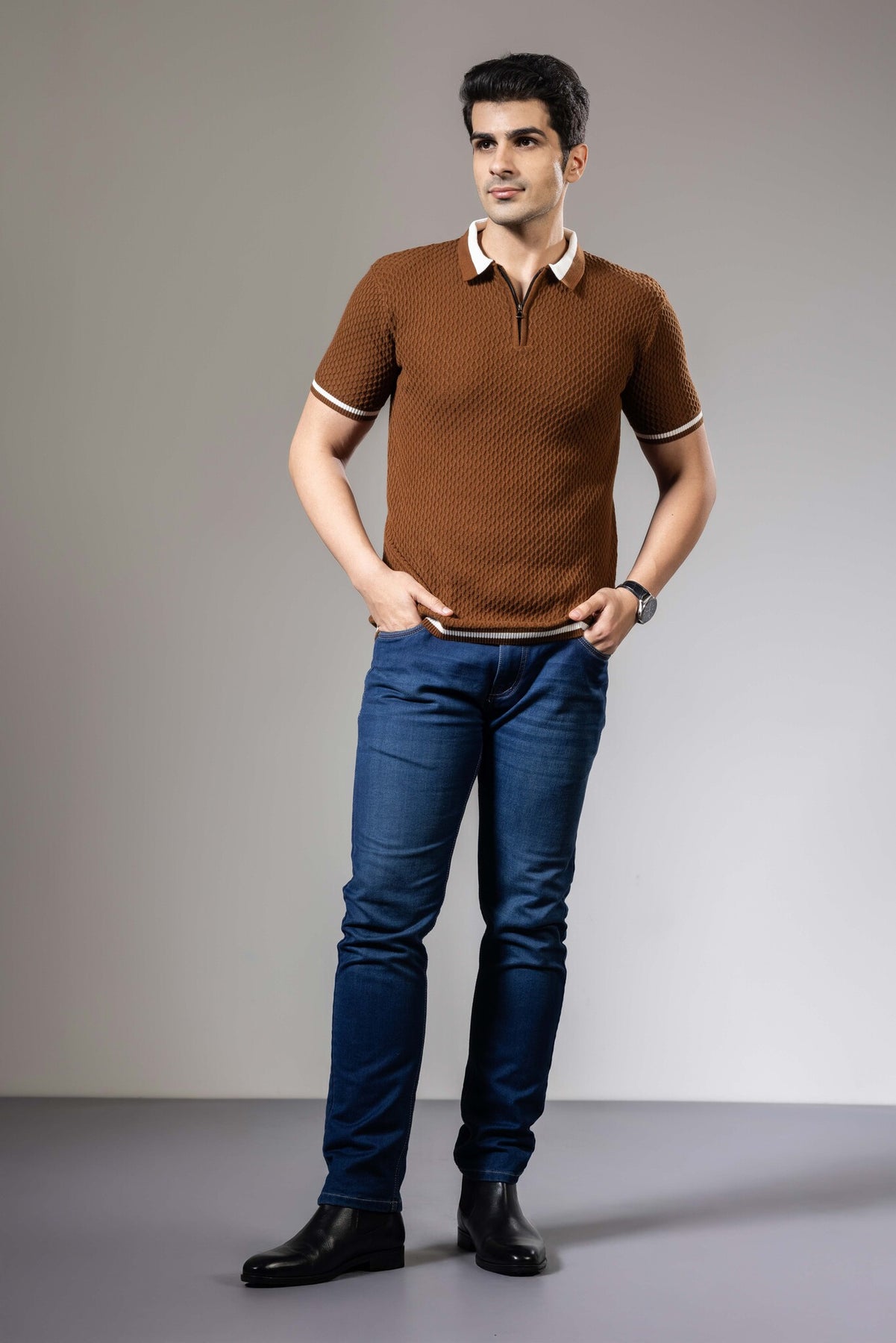 Brown White Self Desing Premium Flat Knit Polo T-Shirt