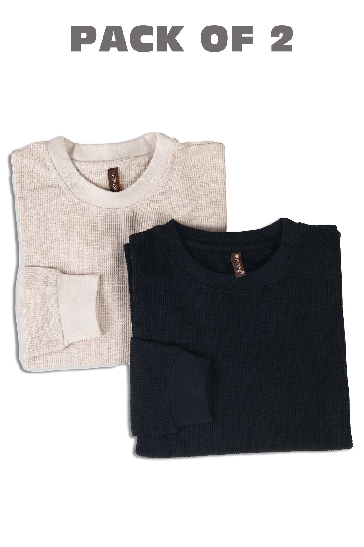 Cream & Black Self Design Waffle Round Neck T-Shirt