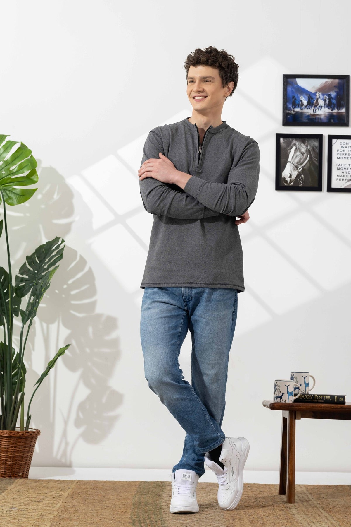 This t-shirt is crafted from waffle knit fabric, known for its unique textured pattern that enhances breathability and gives a rich, premium look. The zipper neckline adds a contemporary edge, allowing adjustable styling—from a relaxed open collar to a sharp, closed look.