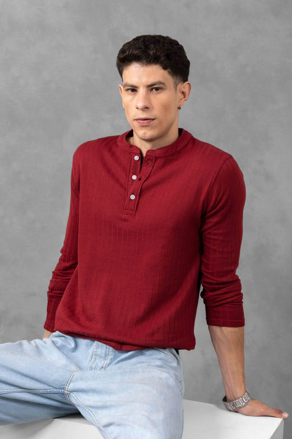 This regular fit henley neck t-shirt from Gritstones is made in 100% cotton fabric and comes with unique self pattern. Featuring full sleeves and henley neck, it combines style and comfort effortlessly. Perfect for smart casual and streetwear looks, it's a must have for the fashion-forward men.