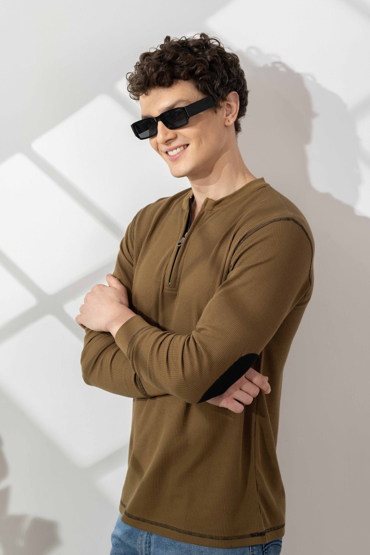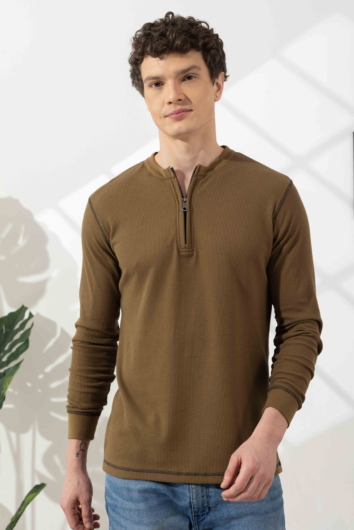 This t-shirt is crafted from waffle knit fabric, known for its unique textured pattern that enhances breathability and gives a rich, premium look. The zipper neckline adds a contemporary edge, allowing adjustable styling—from a relaxed open collar to a sharp, closed look.