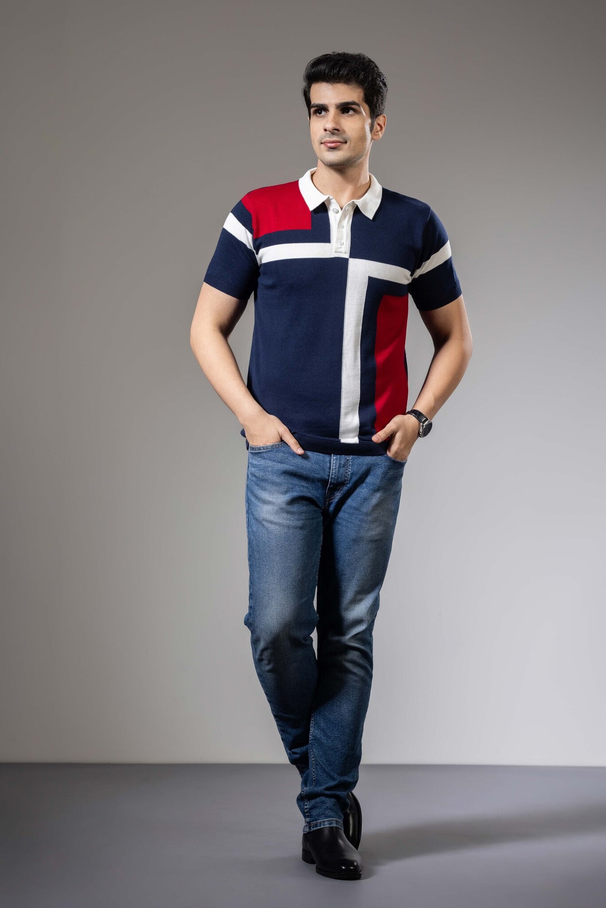 Red White Color Blocked Premium Flat Knit Polo T-Shirt