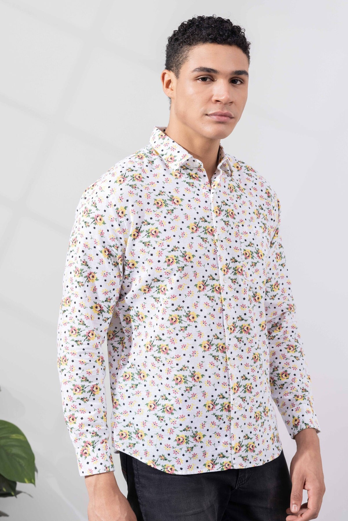 This is a stylish men’s printed casual shirt featuring a fresh and vibrant design. The shirt comes in a white base color adorned with an all-over floral print in soft shades of yellow, pink, and green, giving it a lively and modern appeal.