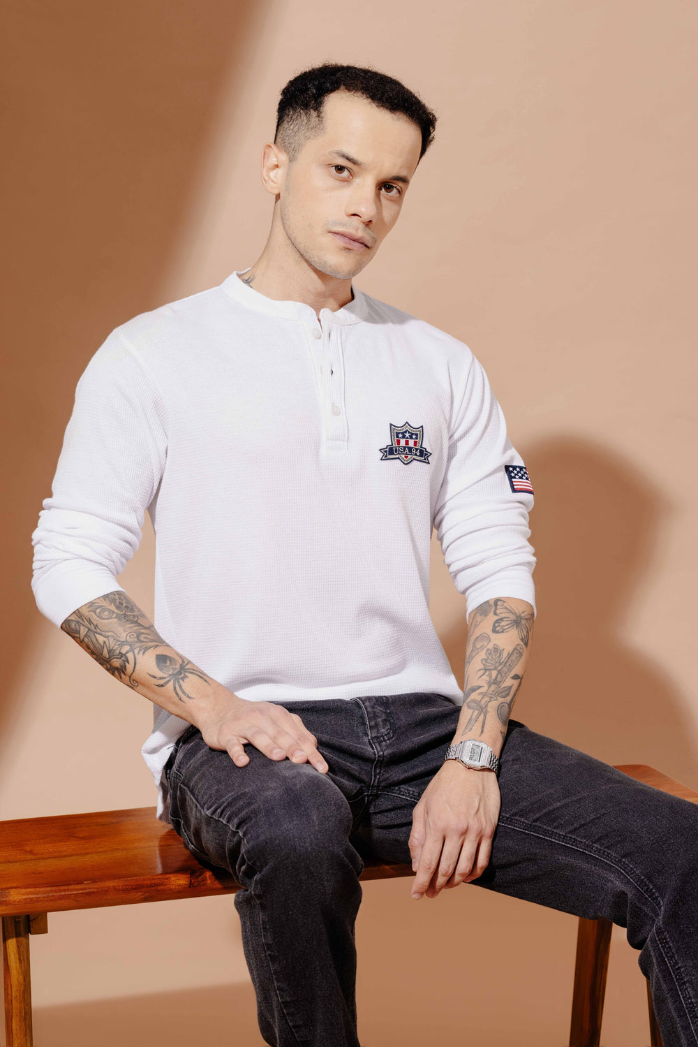 This regular fit henley neck t-shirt from Gritstones is made in 100% Waffle knit fabric and comes with unique self design pattern. Featuring full sleeves and henley neck, it combines style and comfort effortlessly. Perfect for smart casual and streetwear looks, it's a must have for the fashion-forward men.